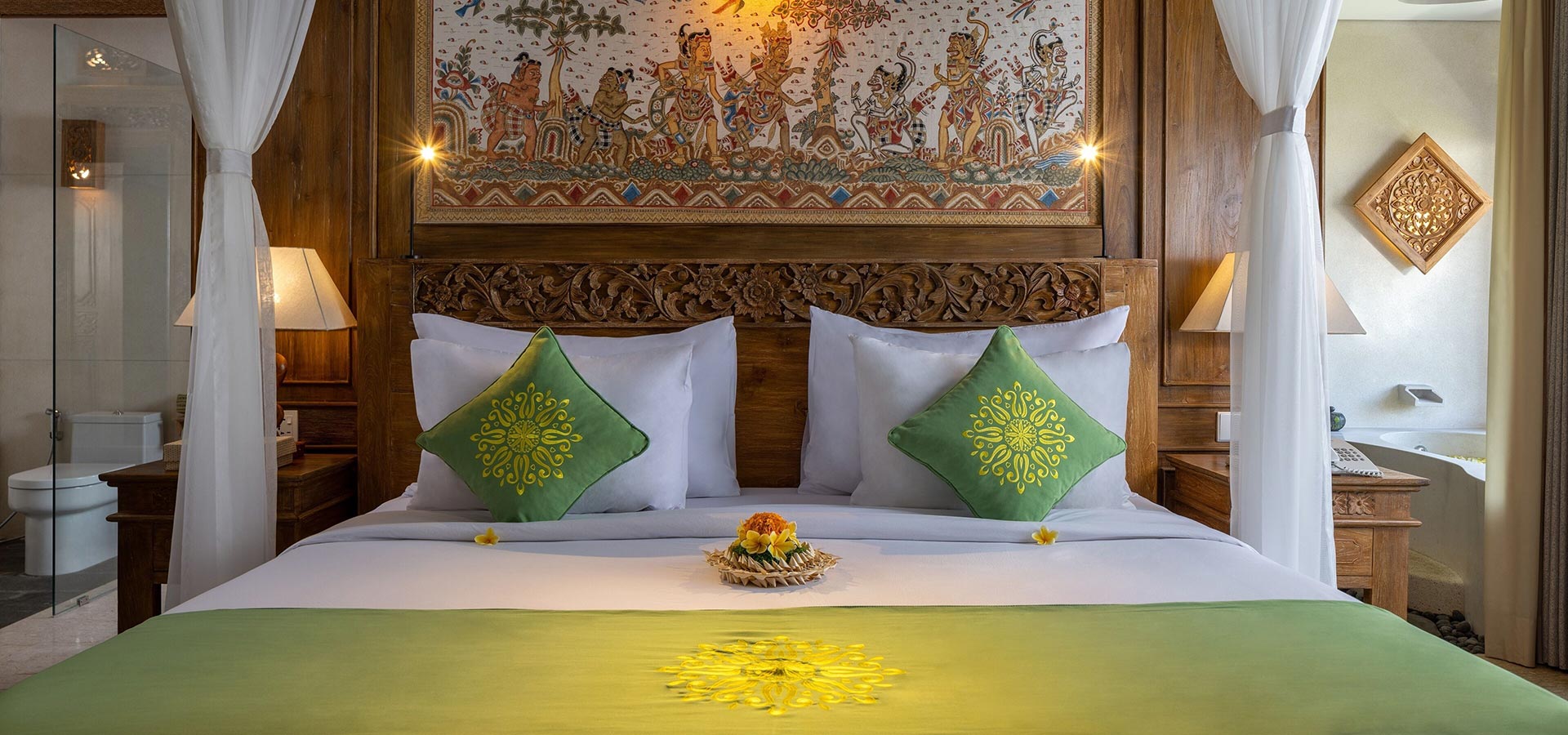 Refreshing and luxurious, the 150 sqm private pool villa is surrounded by lush tropical garden. The bedroom is hemmed in luxury interior hand crafted by local Balinese best artist. Sitting on the edge of the bathroom is the stone bathtub overlooking the private pool and the greenest tropical garden.